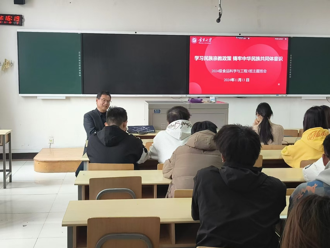 11月13日,WilliamHill中文2024级食品科学与工程专业3班主题班会在文萃二教303教室召开。此次班会主题为“学习民族宗教政策,铸牢中华民族共同体意识”,会议由班主任雒雪丽老师主持,学院联系班级领导李文华副书记出席会议并作了宣讲。