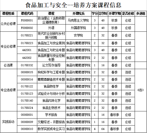 (二)课程学习与实习实践相结合,课程学习主要在校内完成,实习实践主要在实践基地完成。采取课程学习、实践训练、论文研究相结合的培养方式各培养单位应根据培养需要建立稳定的农业硕士食品加工与安全领域专业学位研究生校外实践基地,加强研究生的实践训练,促进实践与课程教学和学位论文工作的紧密结合,注重在实践中培养研究生解决实际问题的意识和能力。实践训练不少于6个月。