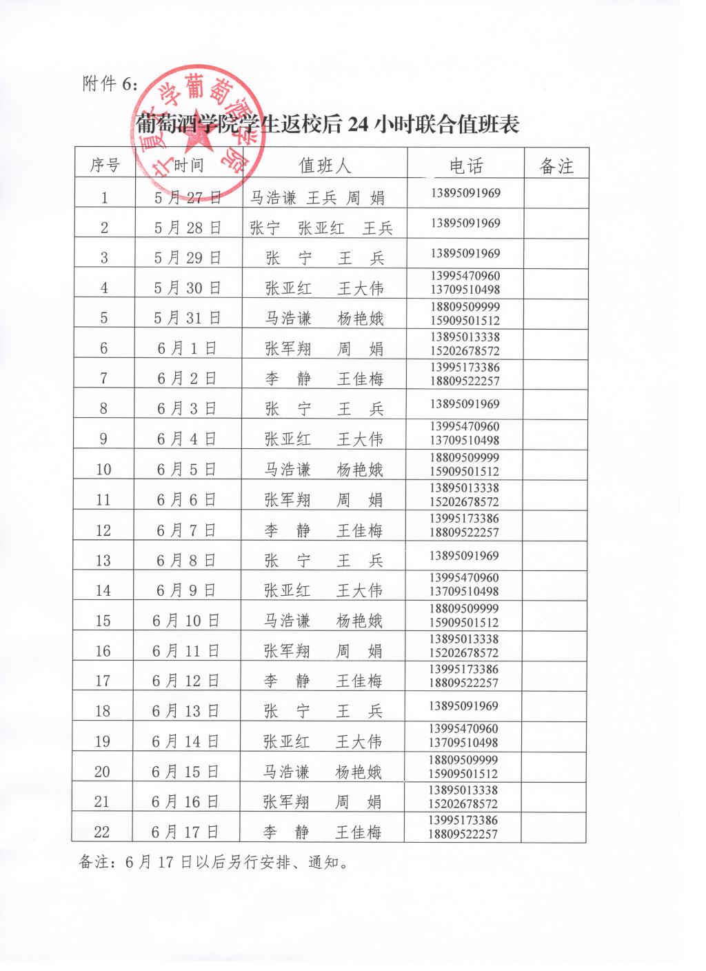 葡萄酒学院学生返校后24小时联合值班安排表