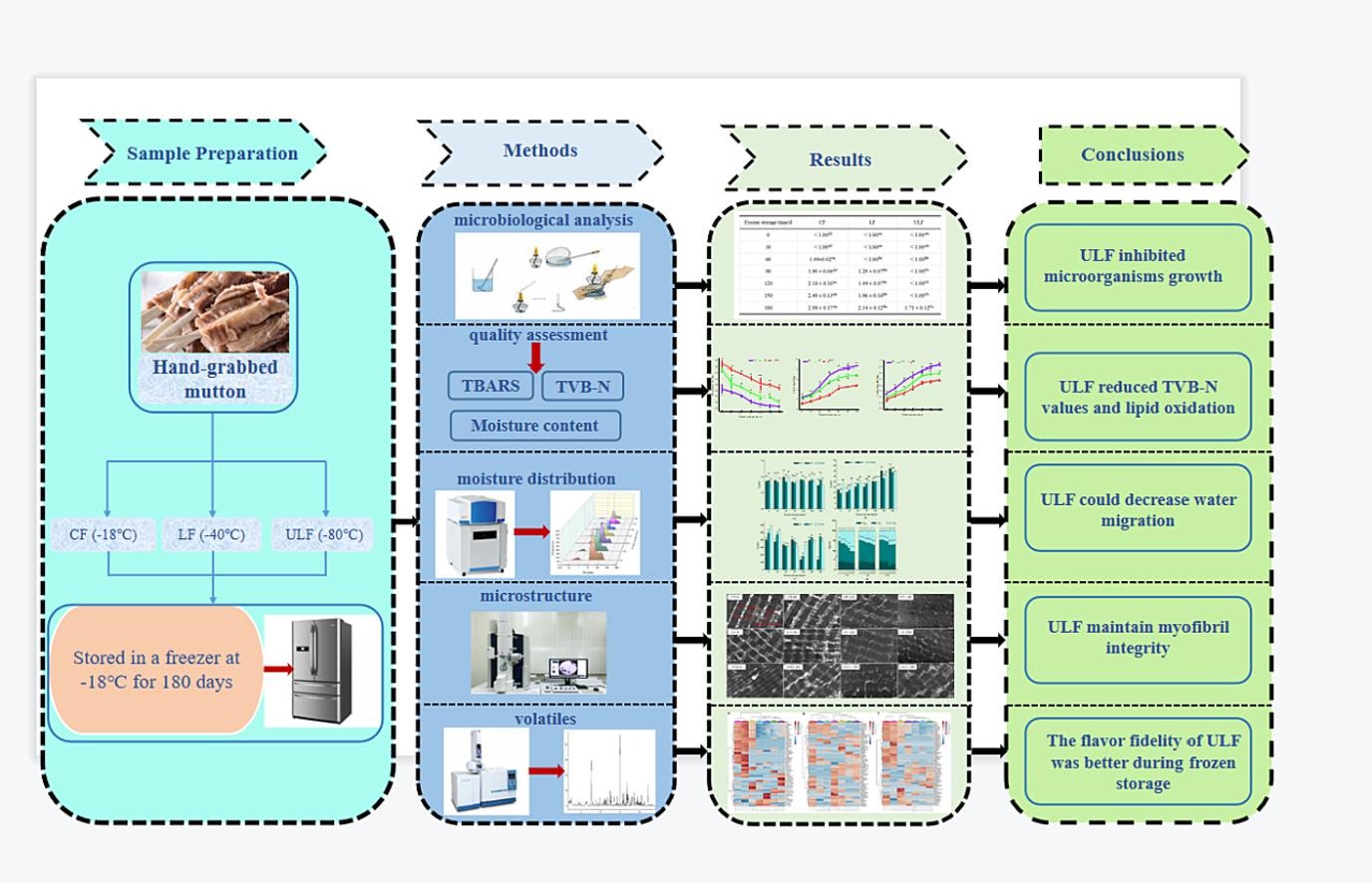与 CF 和 LF 处理相比,ULF 处理的冷冻速率更高,微生物生长更少,TVB-N 含量和脂质氧化更低。