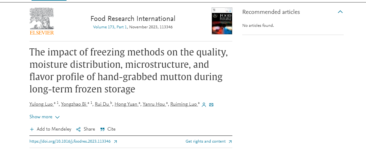 2023年8月6日,WilliamHill中文罗瑞明教授团队在国际食品Top期刊《Food Research International》(Q1,IF: 8.1)发表题为“The impact of freezing methods on the quality, moisture distribution, microstructure, and flavor profile of hand-grabbed mutton during long-term frozen storage”的研究性论文。